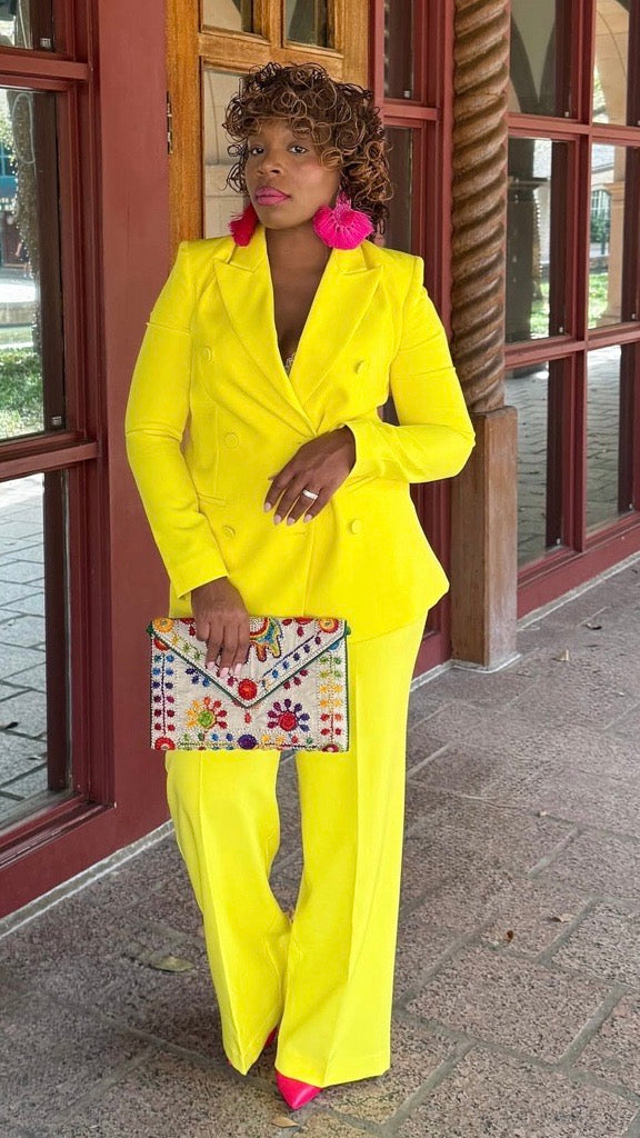 A crisp oversized white button-down shirt paired with wide-leg patchwork denim jeans and a printed clutch bag..