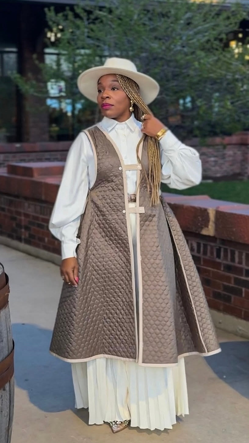 A quilted longline vest in taupe with cream trim layered over a white pleated skirt and white blouse, accessorized with a wide-brim hat and gold jewelry.