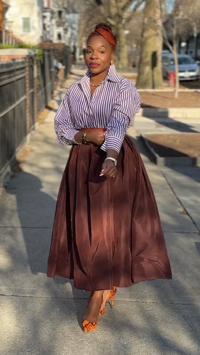 A brown full-length skirt paired with a striped button-down blouse, orange patterned heels, and a head wrap in warm tones.